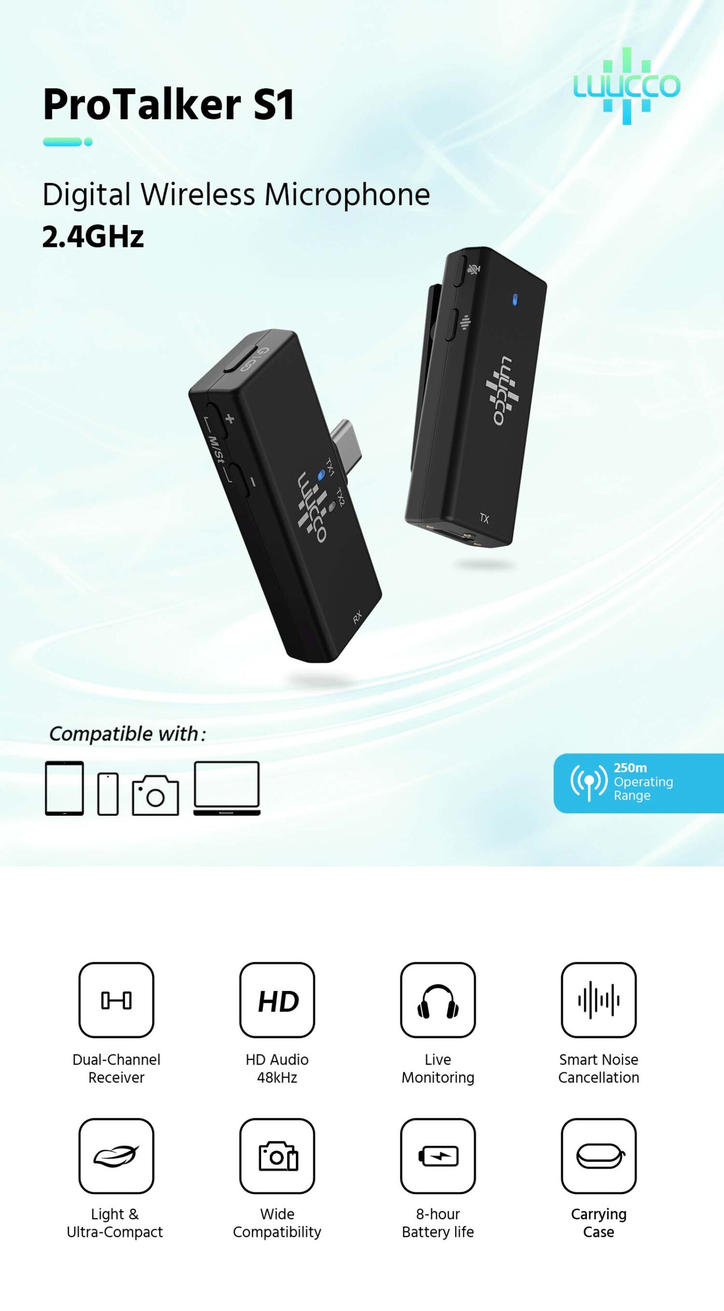 The Luucco ProTalker S1 Microphone Kit is a versatile 2.4 GHz wireless digital microphone, compatible with a wide range of devices such as photo cameras, smartphones (Android and iPhone), tablets, and computers with USB Type-C connection. This state-of-the-art microphone offers an exceptional range of up to 250 meters and uses exclusive technology for stronger and more stable signal transmission.
